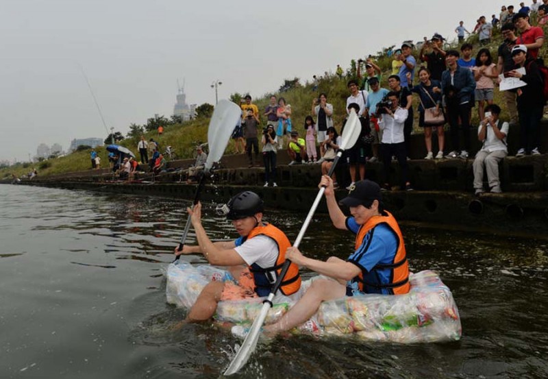 韓大學(xué)生坐“薯片救生筏”渡江 反對食品袋充氣過多
